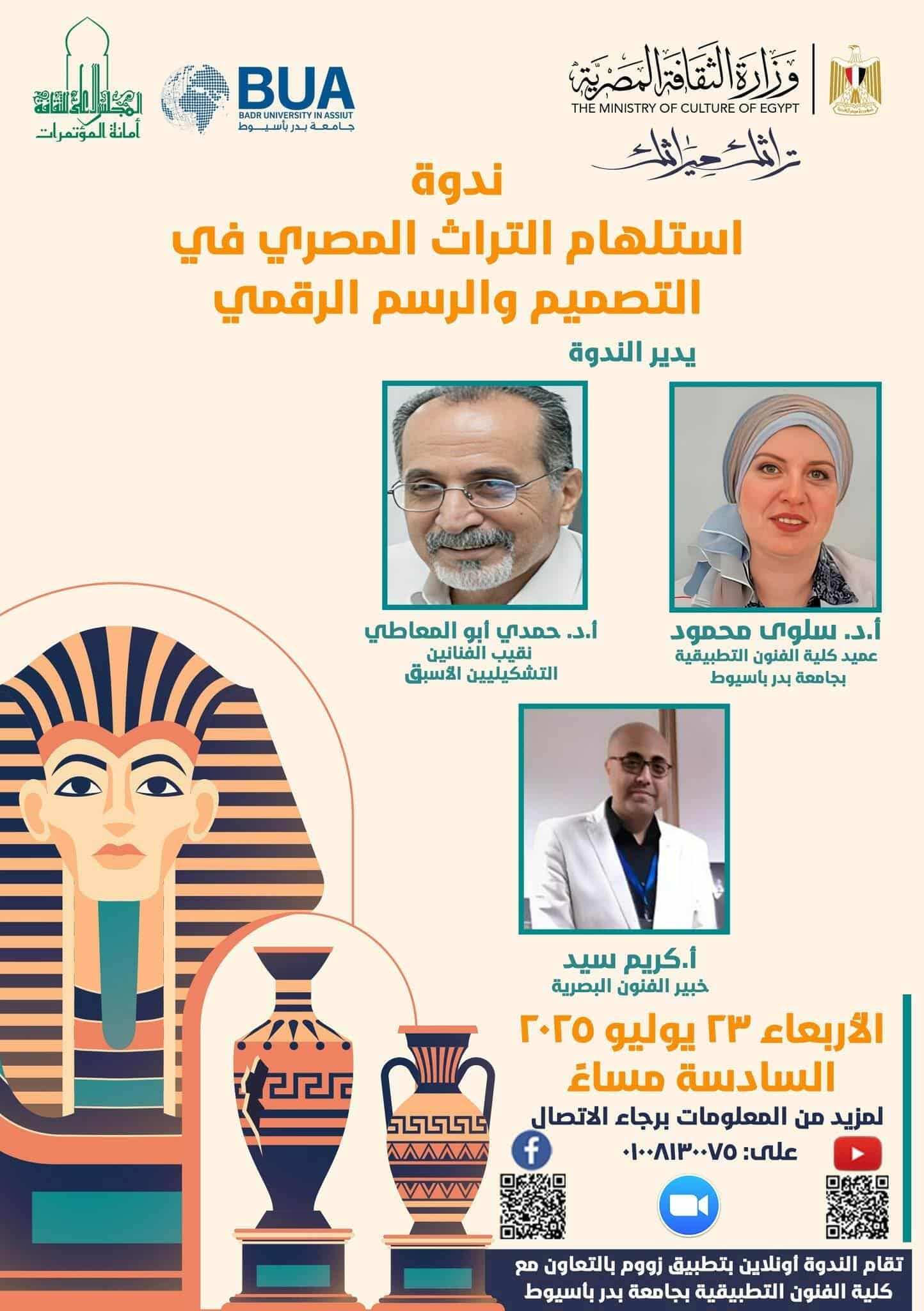 ينظم المجلس الأعلى للثقافة ندوة أونلاين بعنوان استلهام التراث المصري في التصميم والرسم الرقمي مساء الأربعاء 23 يوليو 2025 في تمام الساعة السادسة ضمن فعاليات مبادرة ميراثك تراثك التي تقيمها وزارة الثقافة طوال شهر يوليو
